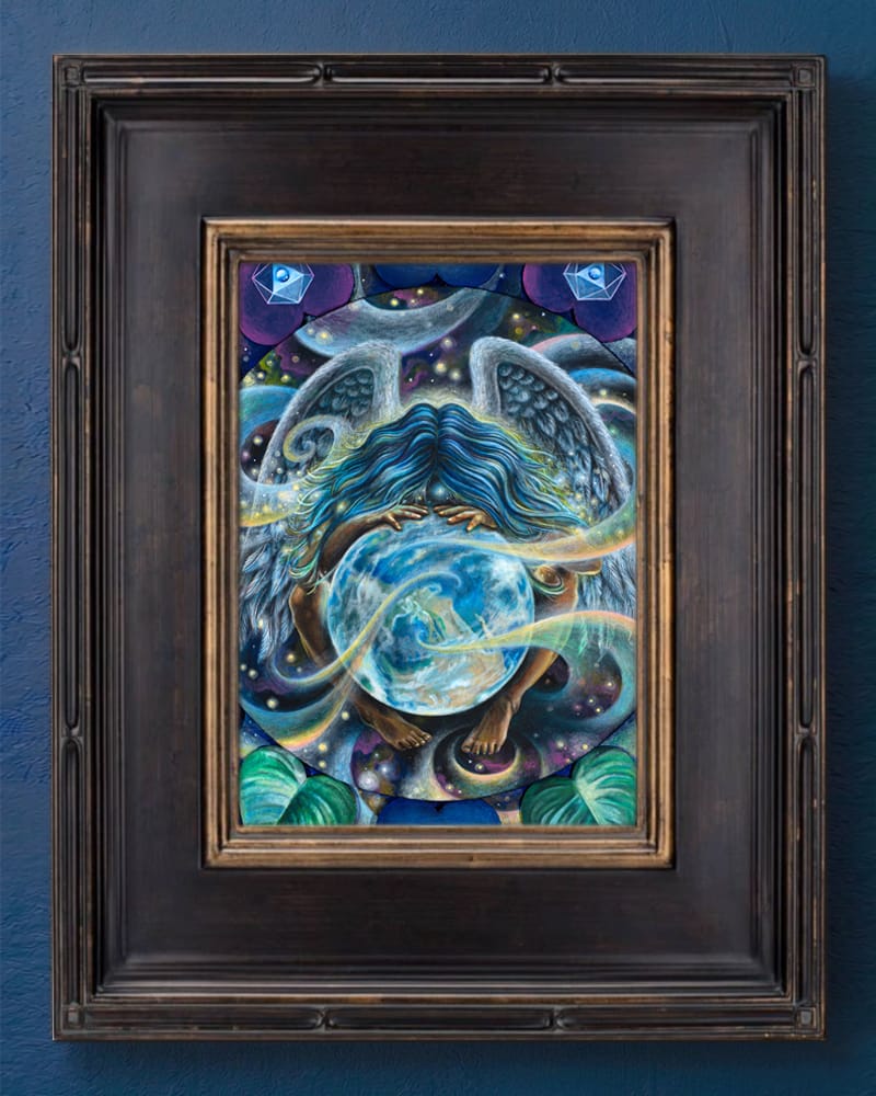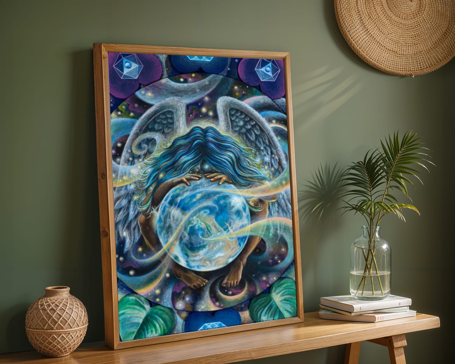 A luminous winged being, wrapped in light of the cosmos, holds the world in a threshold moment, inviting you to remember hope, no matter the storm.