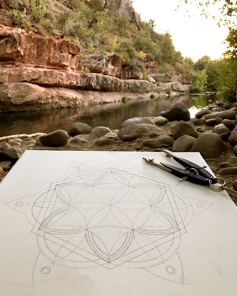 Each piece evolves in its own time. I "massage" the canvas with each brushstroke until all the elements truly come alive. Oftentimes, after a solid studio session, I'll sit in front of my easel for up to an hour or more, having a silent conversation with what's emerging, receiving guidance for next steps.